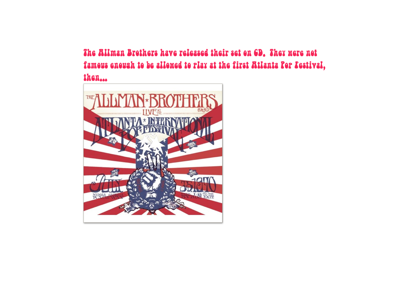 Let us celebrate the triumph of Byron. WE DID A THING! To understand its nature and its impact, we must see the Atlanta Pop Festival not as a "music extravaganza," nor simply as an occasion to do all the dope we wanted to in total freedom, a chance to get naked, and a moment of meditation but - and this is absolutely basic -as a people's assembly in, of, and for Woodstock Nation, population in the millions, of whom several hundred thousand were gathered at Byron, Georgia. It is the year 2, the second year in the life of our new nation—Woodstock Nation—born on the streets of Chicago in August of 68, baptized in White Lake, New York. the following summer, evicted from People's Park, educated at Columbia, graduated at Kent State, stronger every day with much more than a chronological growth: a new nation, conceived in the bowels of the Monster and dedicated to the liberation of all the Kirns from all the Spiros. Learning more about How in Byron.